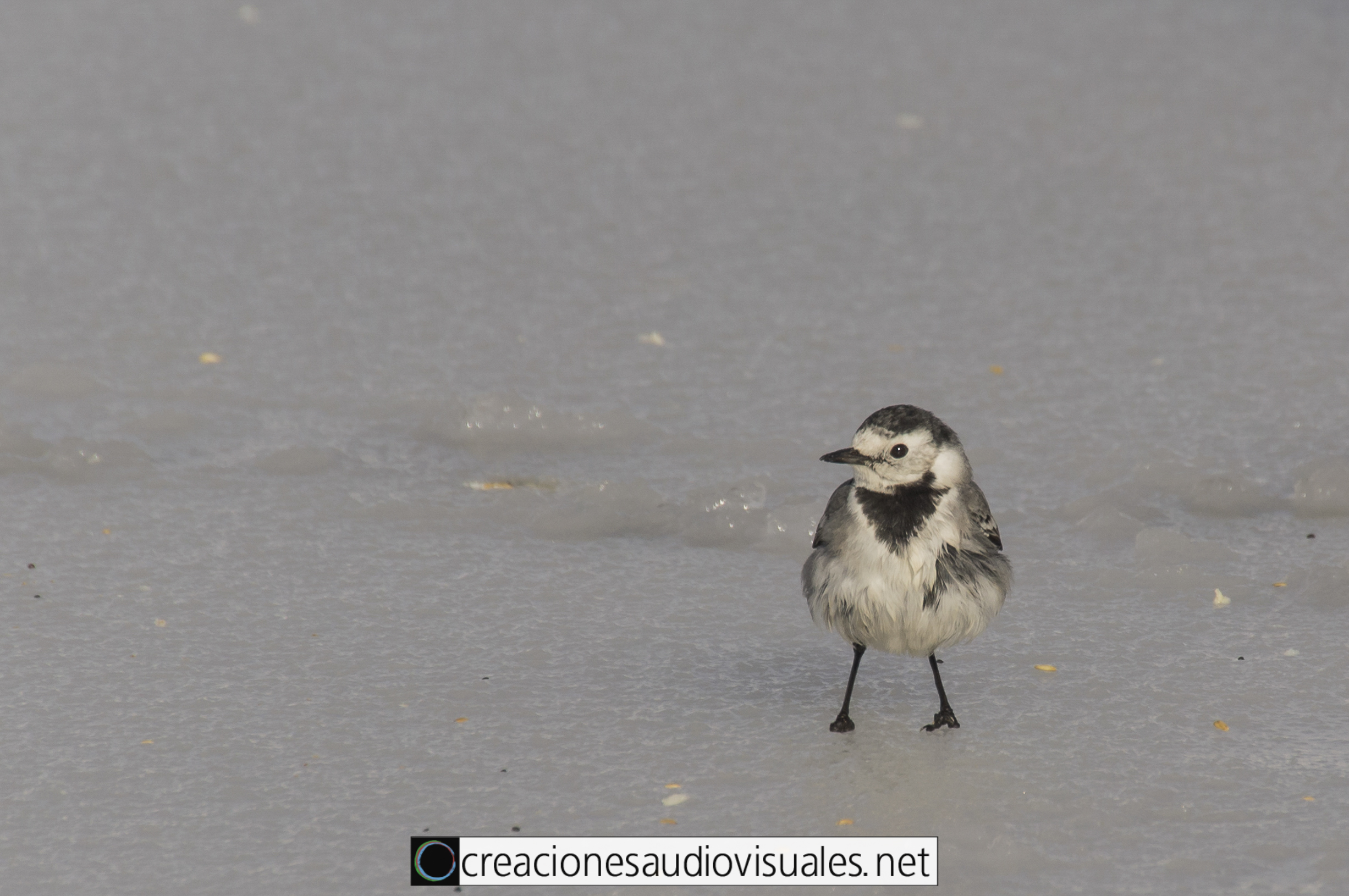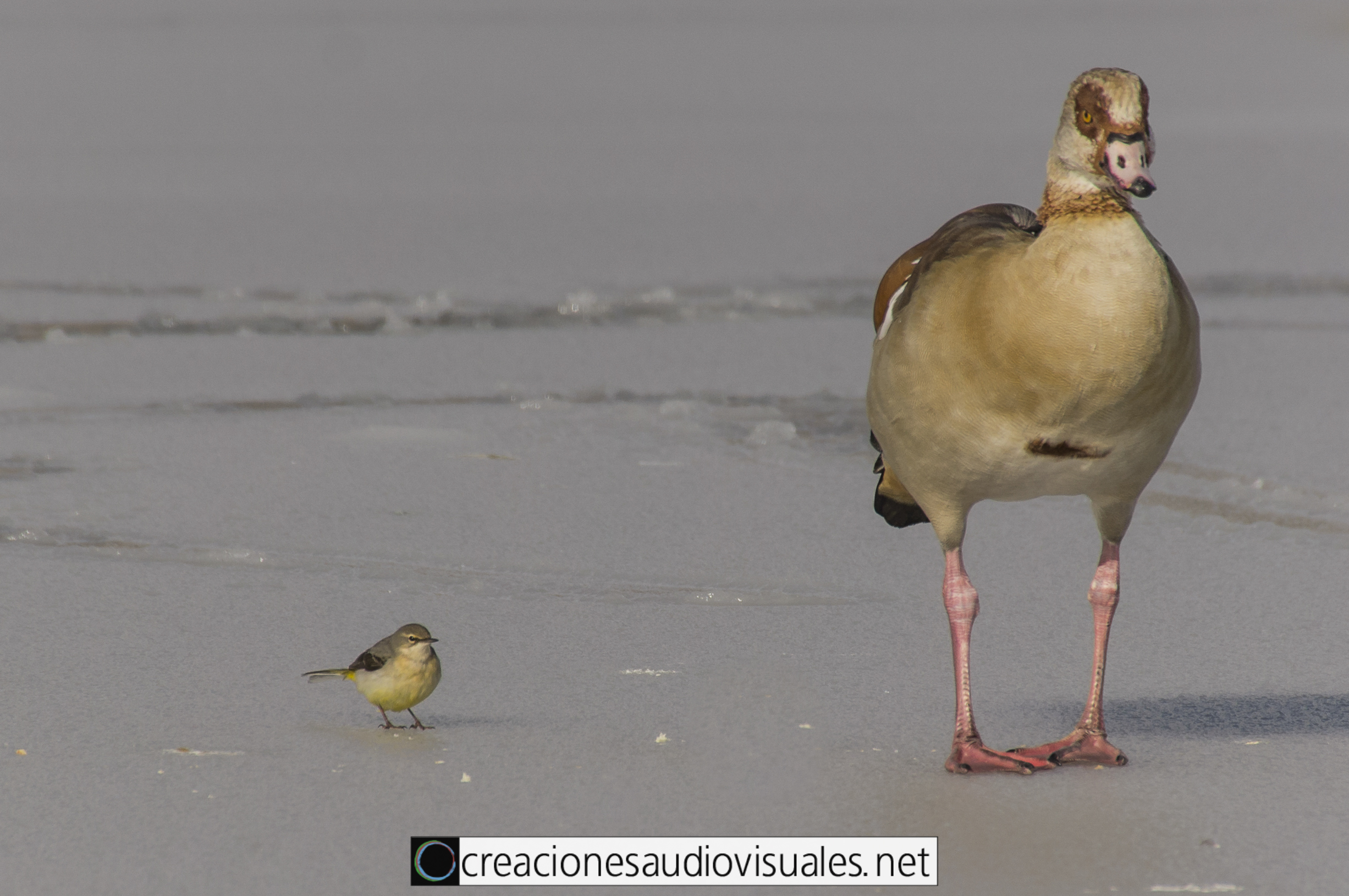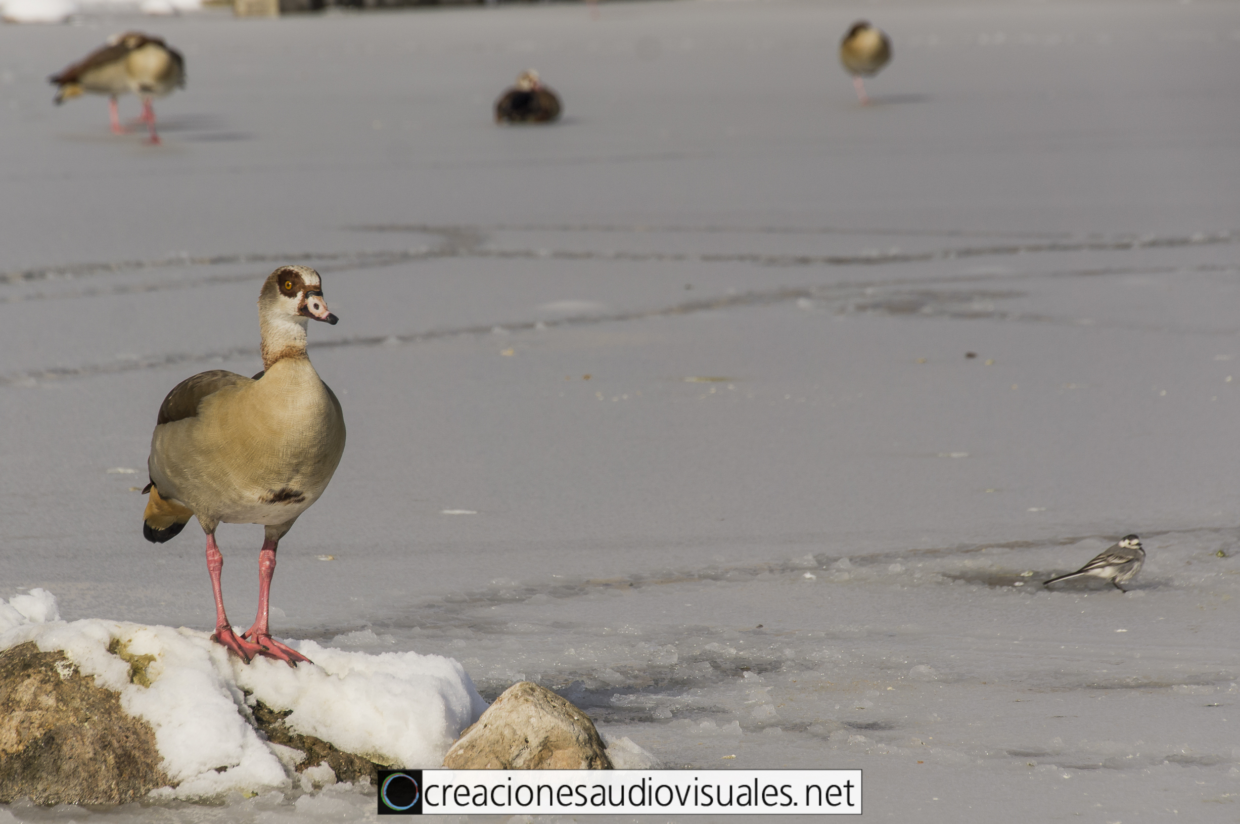 En el estanque congelado tras el temporal comparten espacio y alimento lavanderas cascaceñas y lavanderas blancas, gansos del Nilo, gorriones y un cisne entre otras especies…
