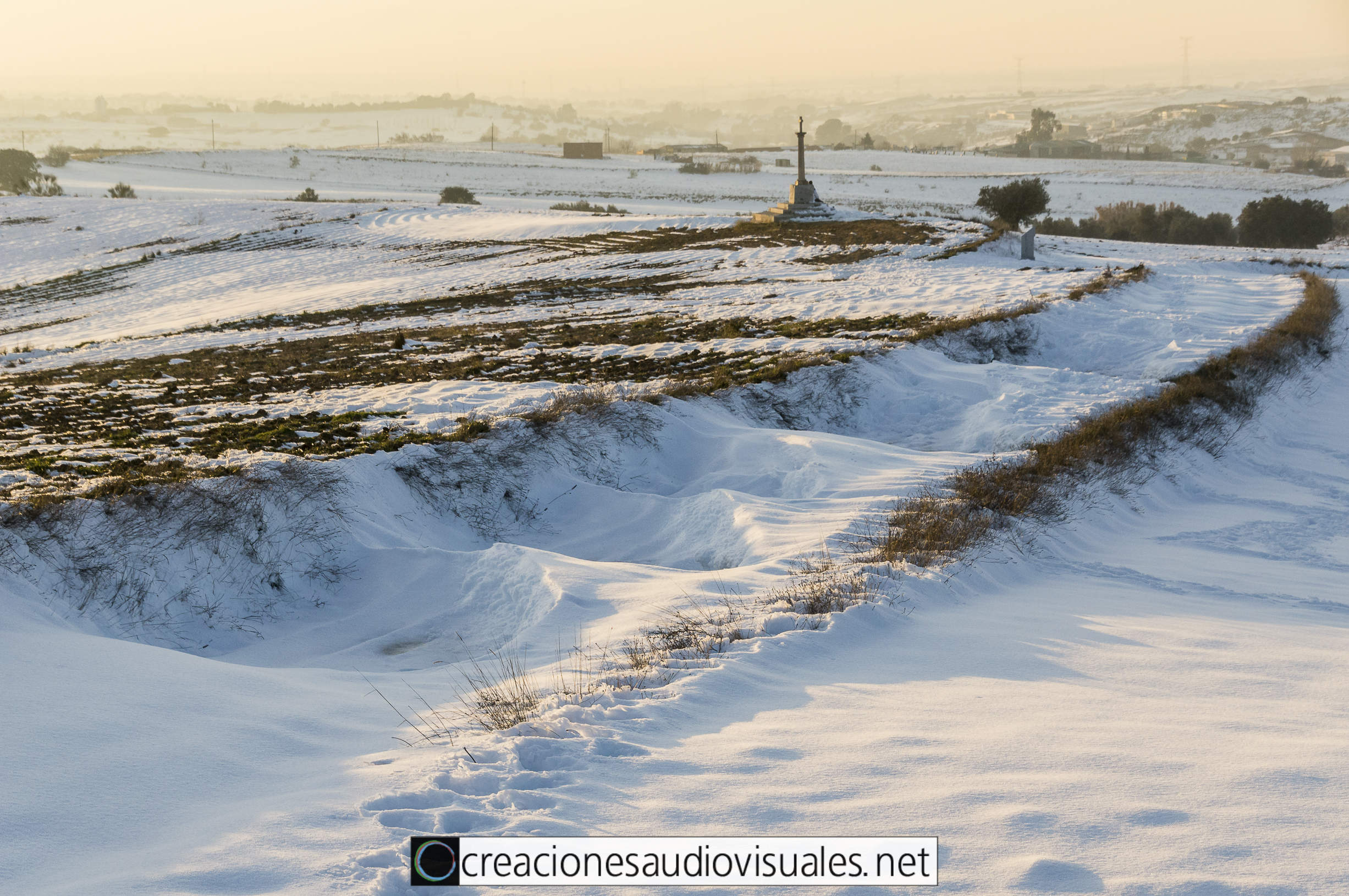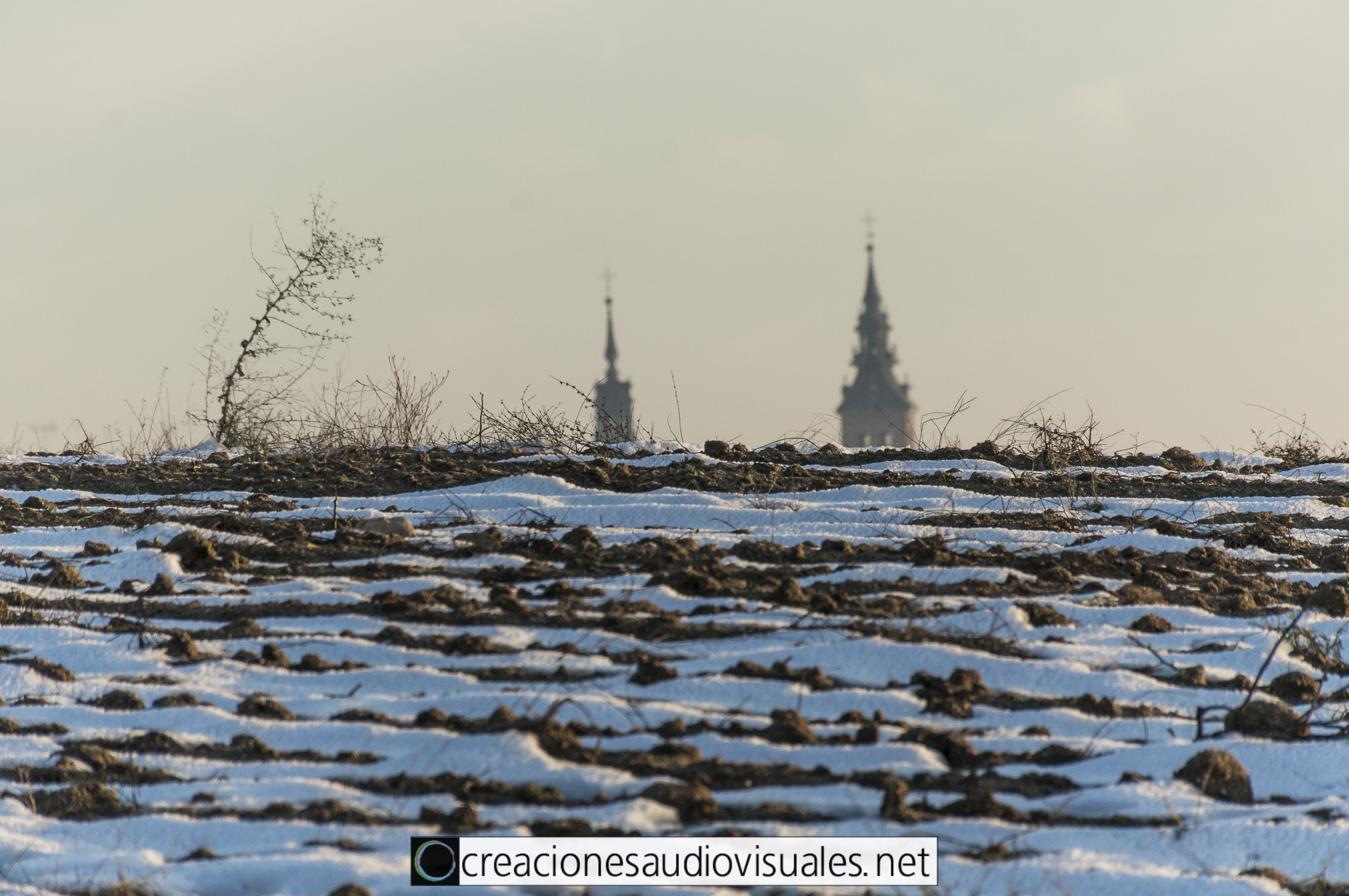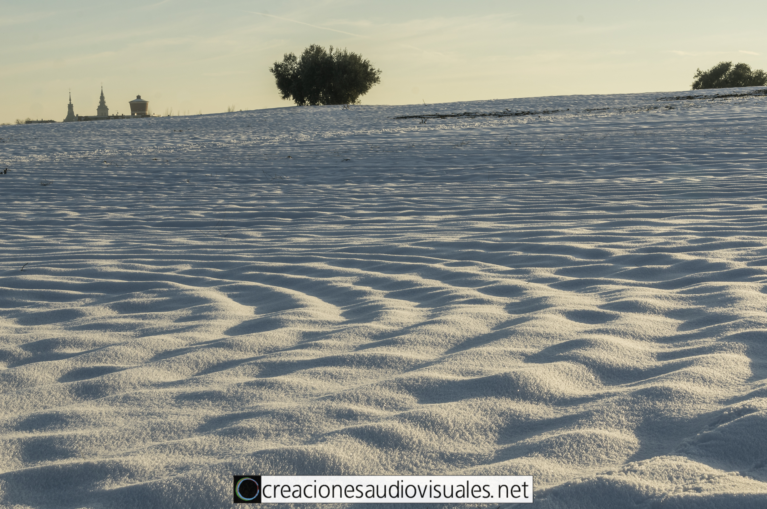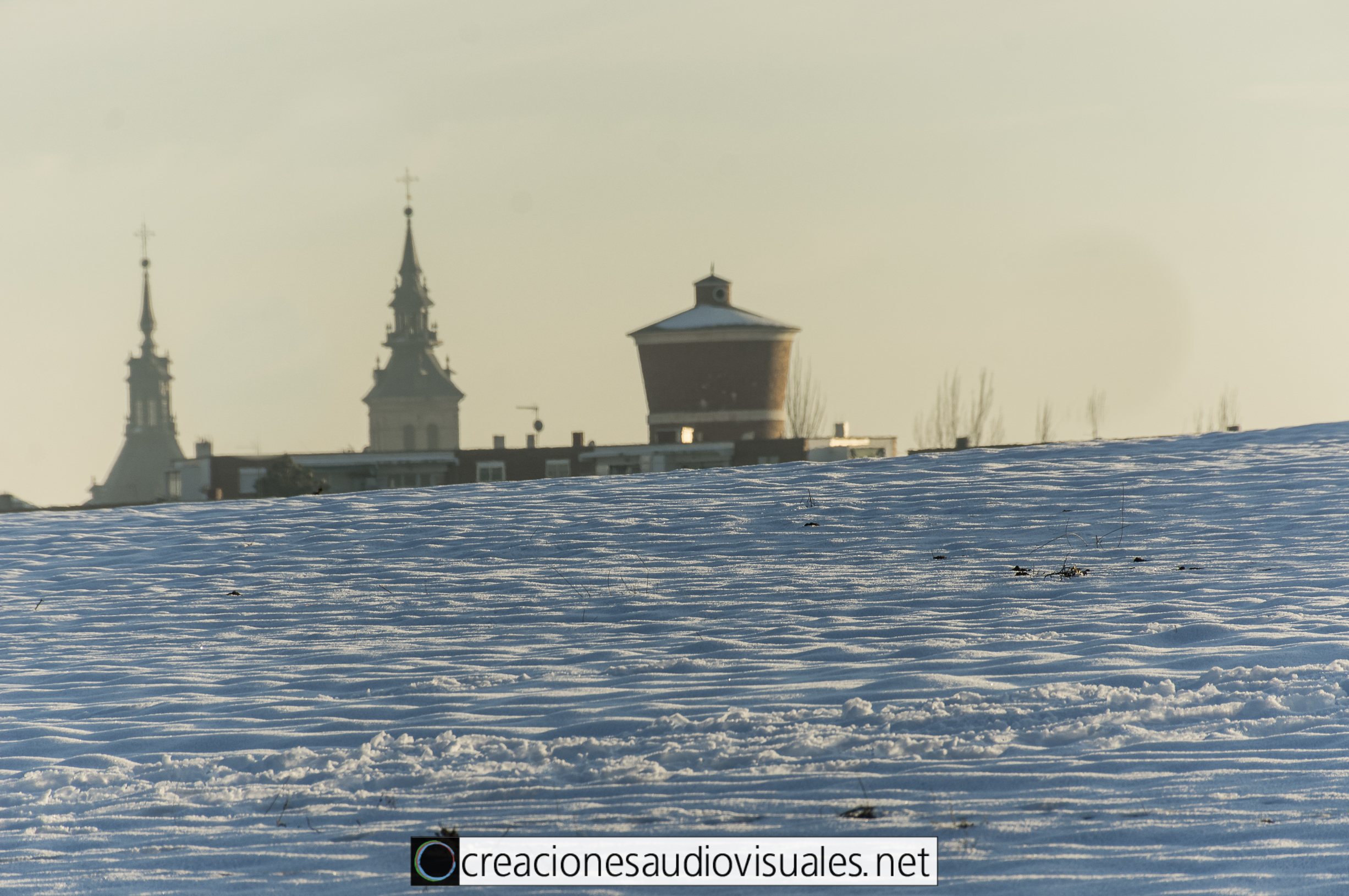 El temporal nos deja curiosas instantáneas de nuestros paisajes. Al fondo de un mar de nieve se intuye el skyline de Navalcarnero.