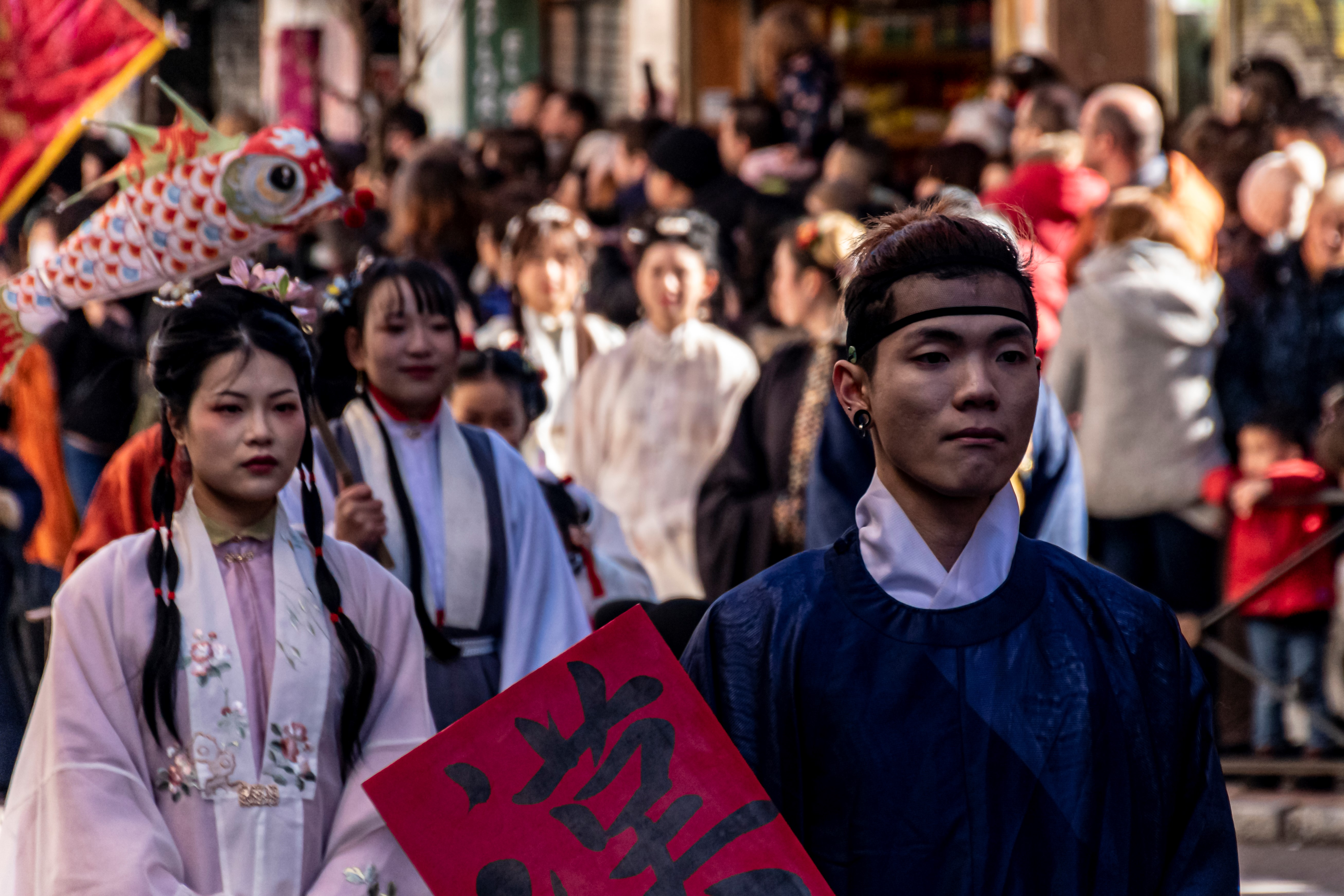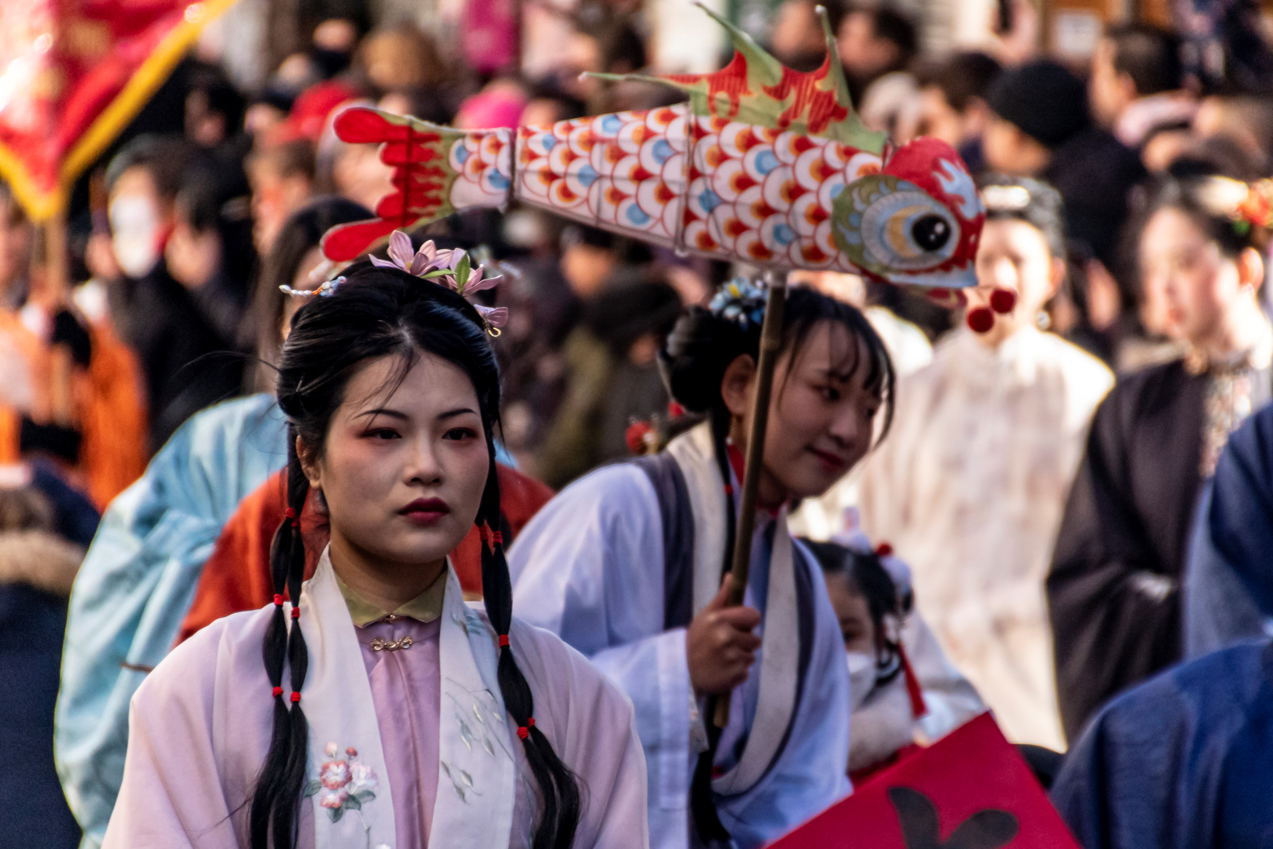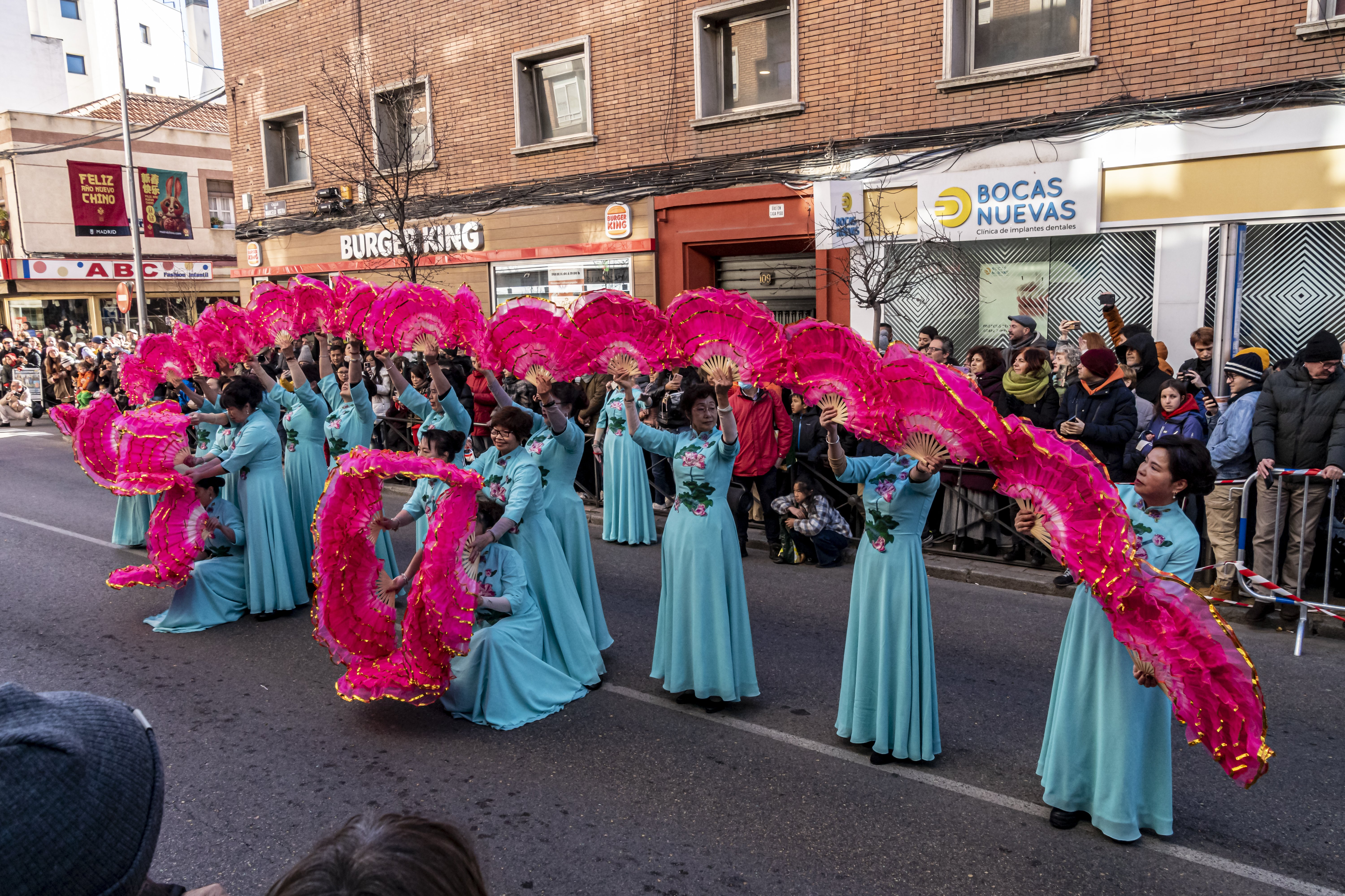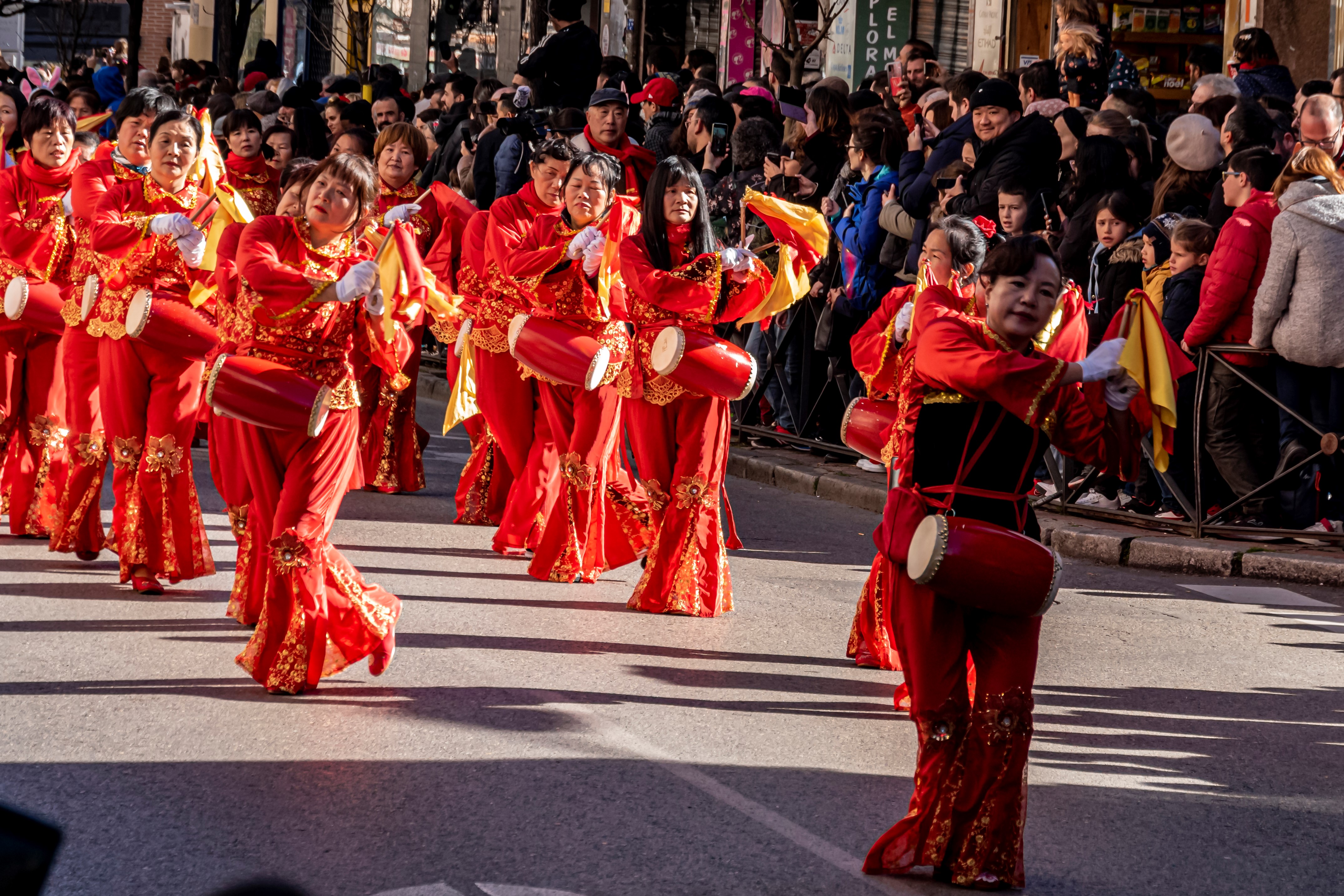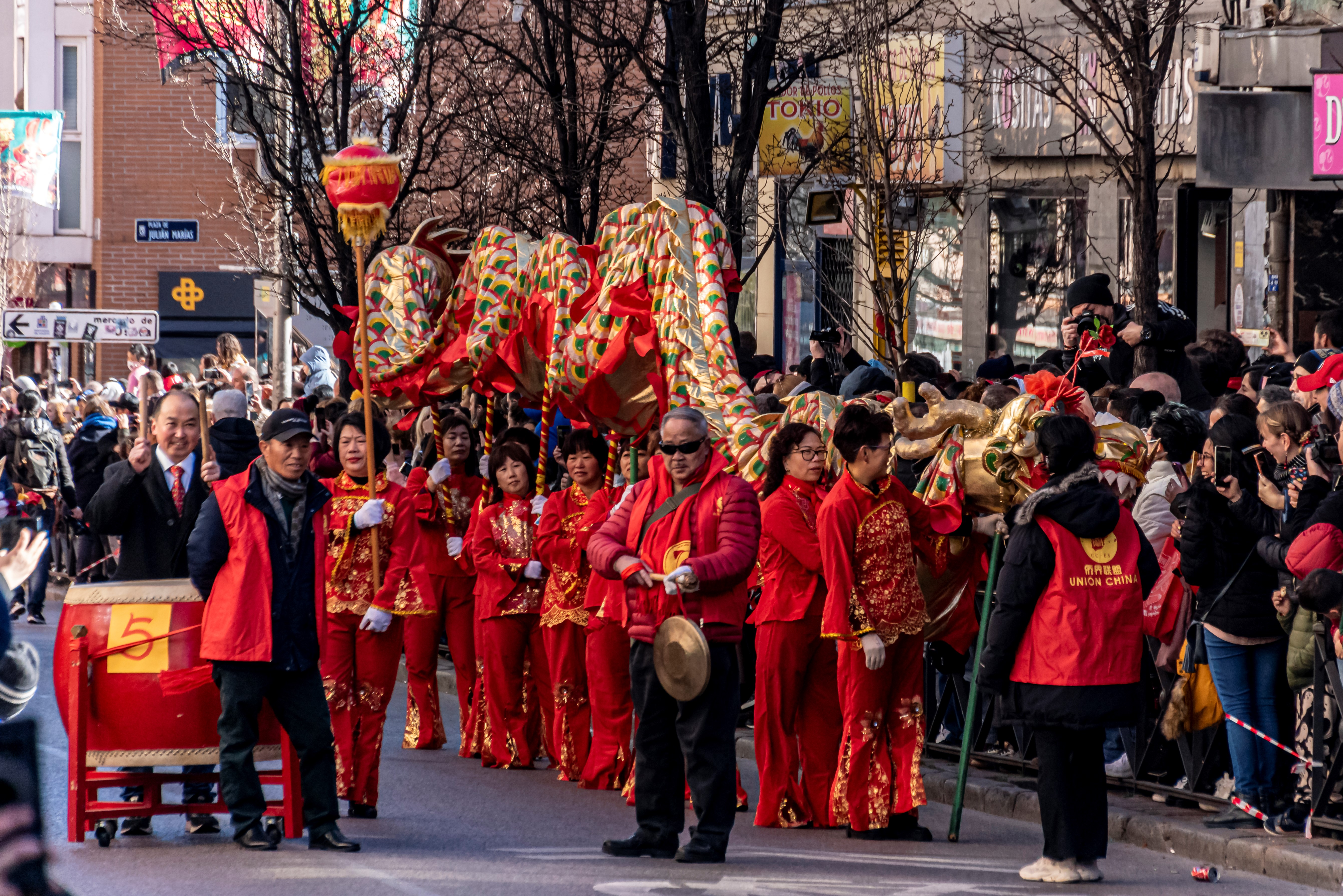 La bienvenida al nuevo año se celebra con un pasacalles muy colorido que recorre la calle principal del distrito de Usera en Madrid. En el desfile la comunidad china muestra sus vestidos y danzas tradicionales. Numerosos Dragones hacen las delicias de niños y mayores y se les espera con impaciencia pues son símbolo de poder, nobleza y honor, así como desuerte y éxito por lo que no se puede ir nadie sin tocarlo.